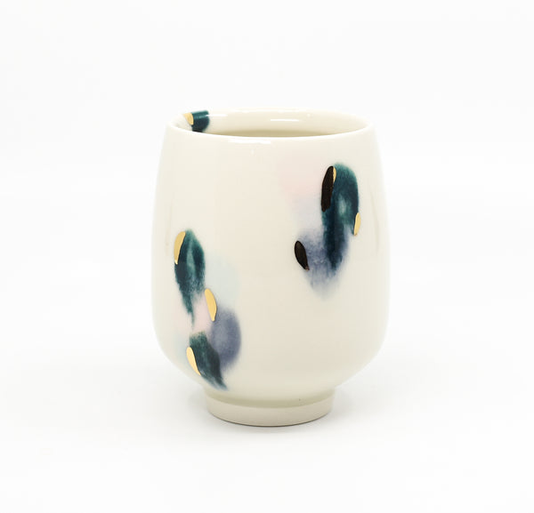 This cup is perfect for your five o'clock cocktail, juice, tea or anything else you like to drink! I threw and trimmed the cup on the potters wheel. I hand decorated it with glaze and fired it to cone 6. I then hand painted gold luster before firing it a third time.