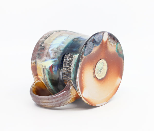 This mug is perfect for your every day coffee, tea or anything else you like to drink! I threw it on the potters' wheel in b-mix clay. I then hand carved and decorated it with underglaze and glaze. I soda fired it to cone 10.