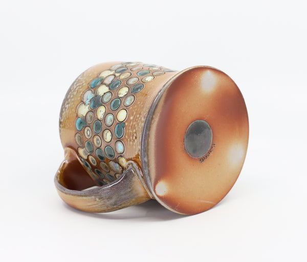 This mug is perfect for your every day coffee, tea or anything else you like to drink! I threw it on the potters' wheel in b-mix clay. I then hand carved and decorated it with underglaze and glaze. I soda fired it to cone 10.