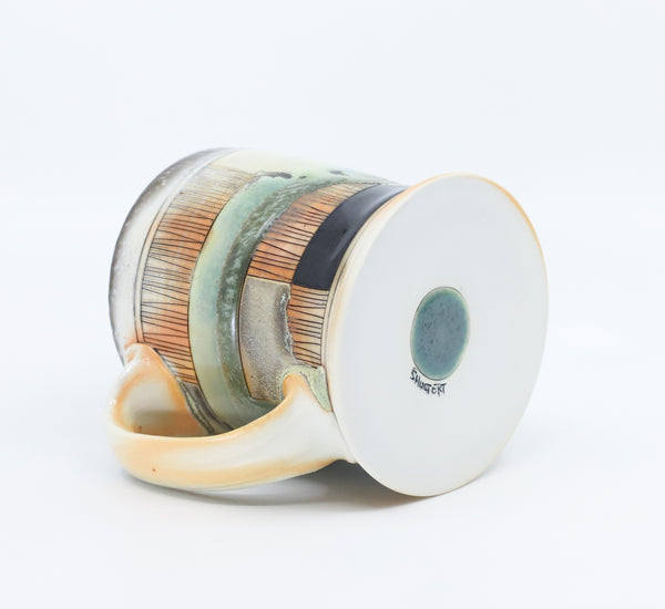 This mug is perfect for your every day coffee, tea or anything else you like to drink! I threw it on the potters' wheel in porcelain. I then hand carved and decorated it with underglaze and glaze. I soda fired it to cone 10.