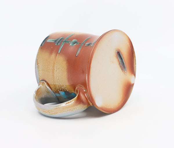 This mug is perfect for your every day coffee, tea or anything else you like to drink! I threw it on the potters' wheel in b-mix clay. I then hand carved and decorated it with underglaze and glaze. I soda fired it to cone 10.
