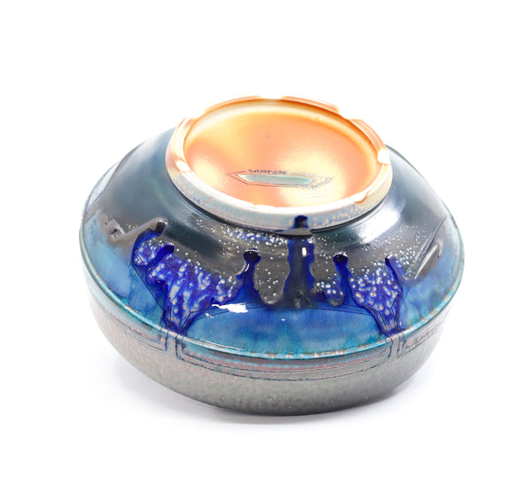 This large serving bowl is perfect for pasta, salad or fruit. I threw it on the potters' wheel in b-mix clay. I then hand carved it, decorated it with underglaze, terra sigillata and glaze, and finally soda fired it to cone 10.