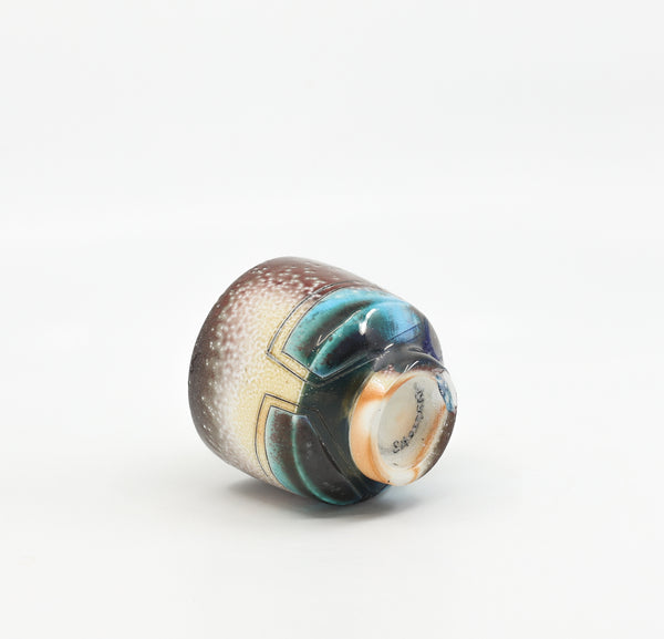 I threw this cup on the potters' wheel in porcelain, then hand carved it. I inlaid it with underglaze, decorated it with glaze and terra sigillata, and soda fired it to cone 10.