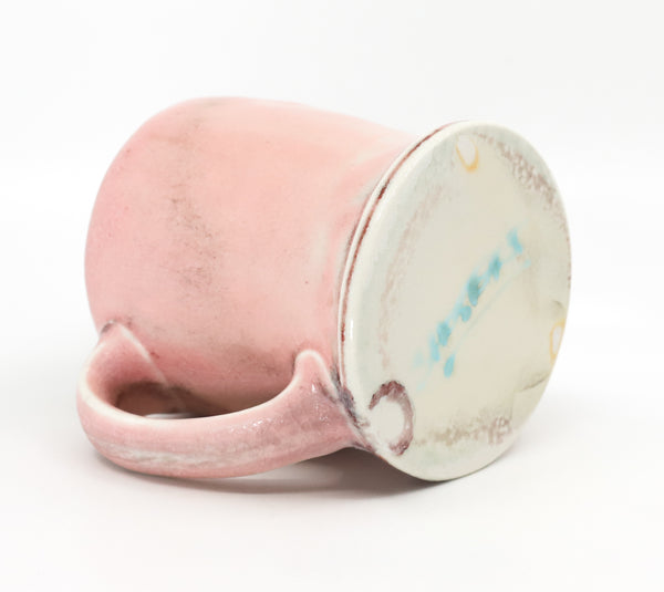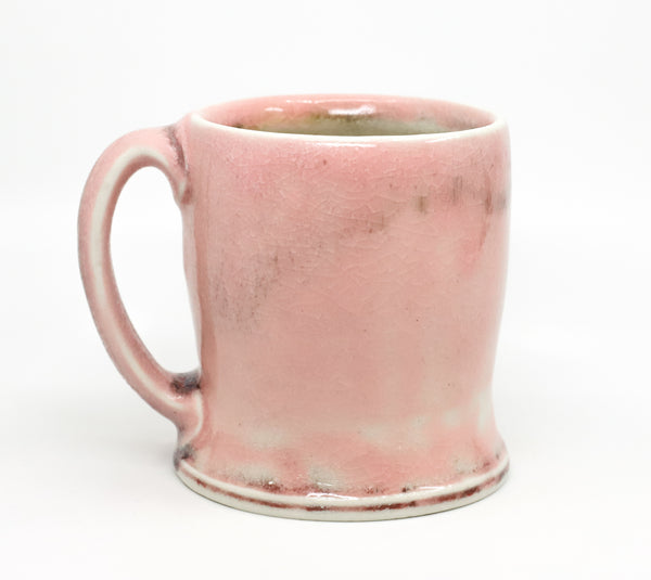 This mug is perfect for your every day coffee, tea or anything else you like to drink! I threw it on the potters' wheel in porcelain with silica sand wedged in. I glazed it with pink shino, and soda fired it to cone 10.