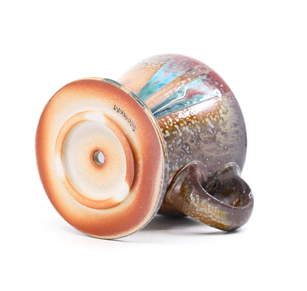 This pour over will make you an immaculate cup of coffee! I threw it on the potter's wheel in b-mix clay. I then hand carved it and added underglaze inlay and and glaze decoration. It is soda fired to cone 10.