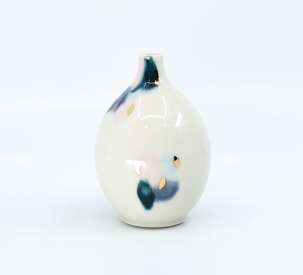 This tiny vase is perfect for display on its own or holding a stem. I threw it on the potter's wheel in porcelain. I hand decorated it with glaze and fired it to cone 6. I then hand painted 22K gold luster before firing it a third time to adhere the gold.
