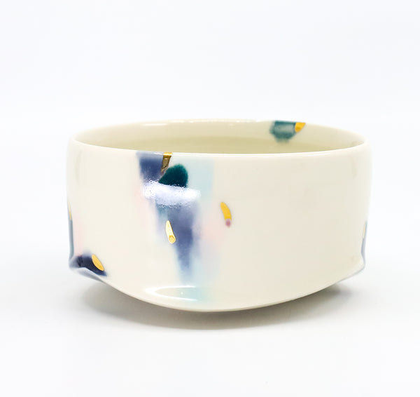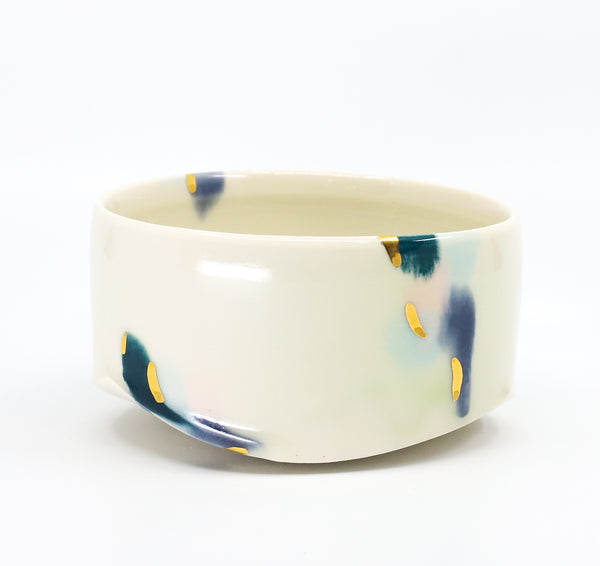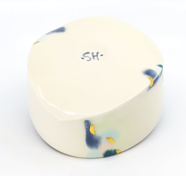 This bowl is perfect for a snack or candy dish, for holding the sauce at your dinner table, or anything else you have a use for. I threw the bowl on the potters wheel, then altered it. I added a slab base molded on a form that I hand-built. I then hand glazed the pattern. After glaze firing, I added 22K gold luster to the surface and fired it a third time to adhere the gold.