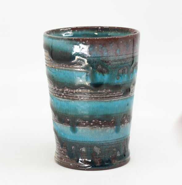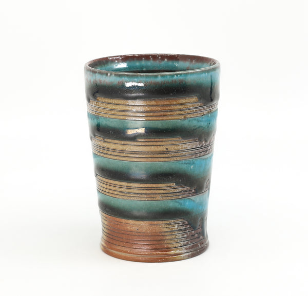 This short tumbler is perfect for your every day water, juice, wine or anything else you like to drink! I threw it on the potters' wheel in b-mix clay. I then hand carved and decorated it with underglaze and glaze. I soda fired it to cone 10.