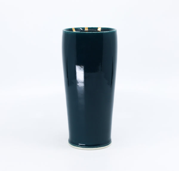 This tumbler is perfect for your every day water, ice tea, or anything else you like to drink! I threw it on the potters' wheel in porcelain. I glazed it in a food safe glaze, and finished it with 22K gold luster.